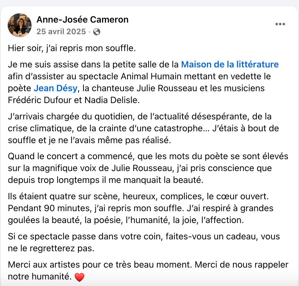 Témoignage d’Anne-Josée Cameron pour le spectacle à la Maison de la Littéraire du 24 avril 2025